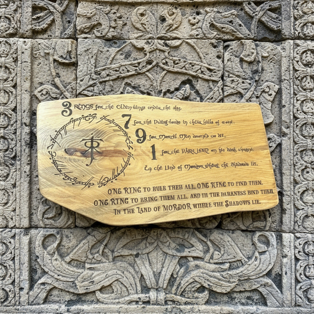 The work of JRR Tolkien is a cornerstone of classic fantasy literature. You cannot possibly be a true fantasy geek or passing D&D player unless you've at least read The Hobbit (Lord of the Rings is also on the required reading list for all Dungeon Masters). This artwork holds the full One Ring quote and is adorned by the famous quote in elvish as well as the personal JRRT rune of the author himself. This is a fantastic signature piece for the serious JRR Tolkien, Lord of the Rings or Hobbit fan.