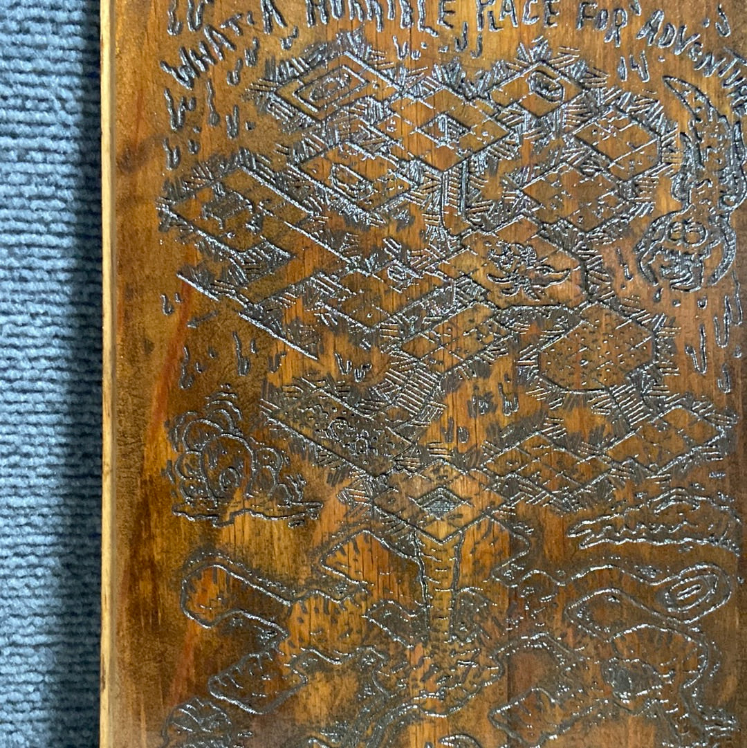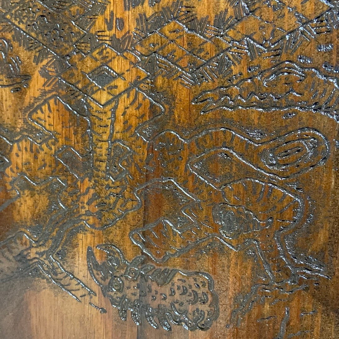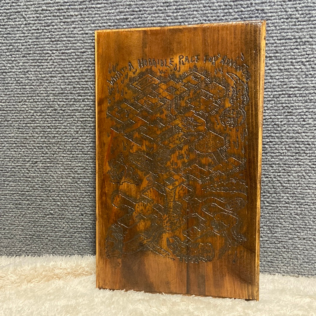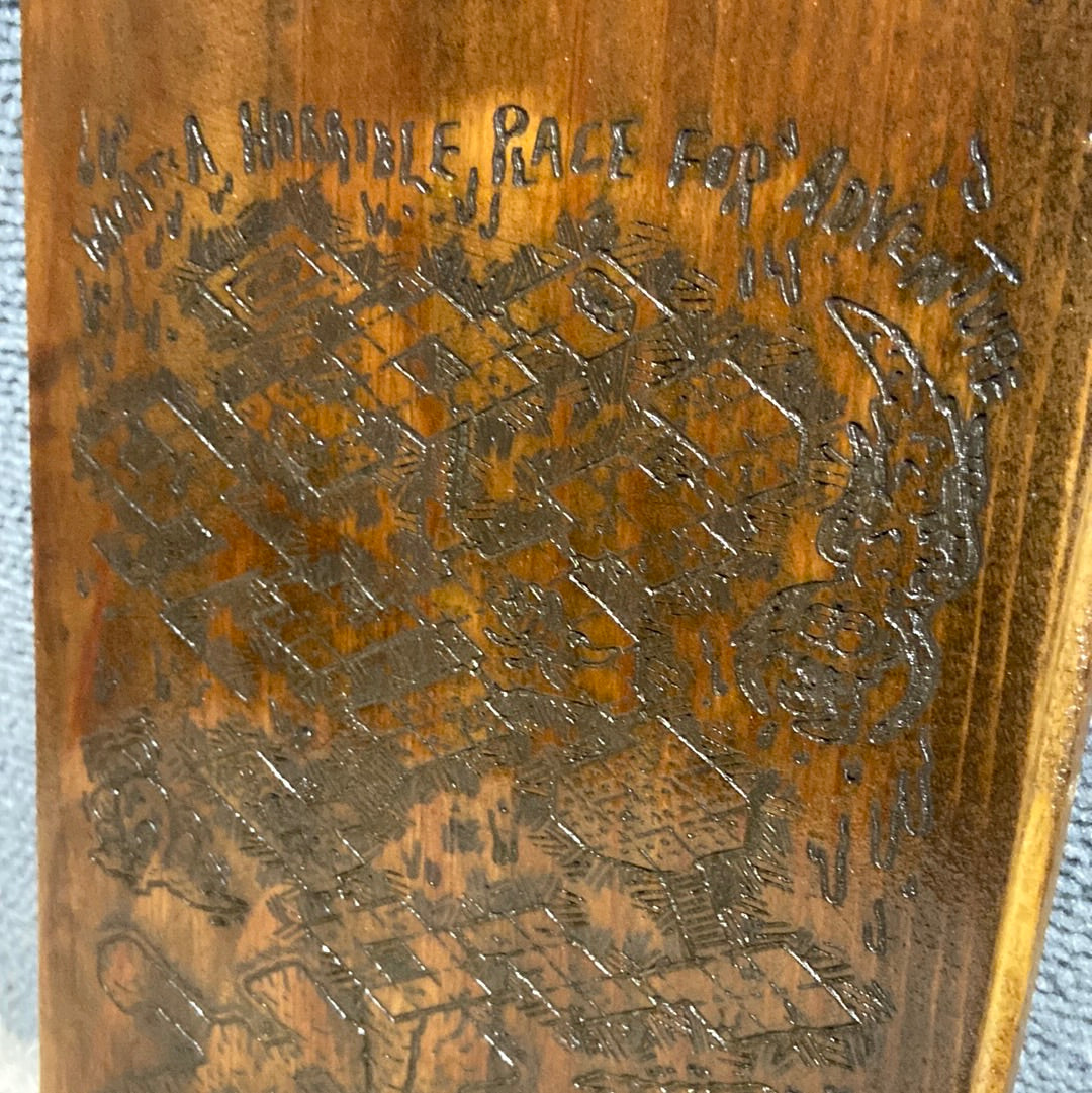 This deadly catacombs drawing has been mapped onto wood and might serve as both warning and help to prospective delvers. This item should be hung outside the entrance to the dungeon. In this case, please instruct adventurers to only copy the map, not remove it. It is enchanted to emit a loud ringing sound similar to a dinner bell at a random point in the middle of said dungeon then teleport back to the entrance. Perspective dungeon on reclaimed oak Appx 8x12