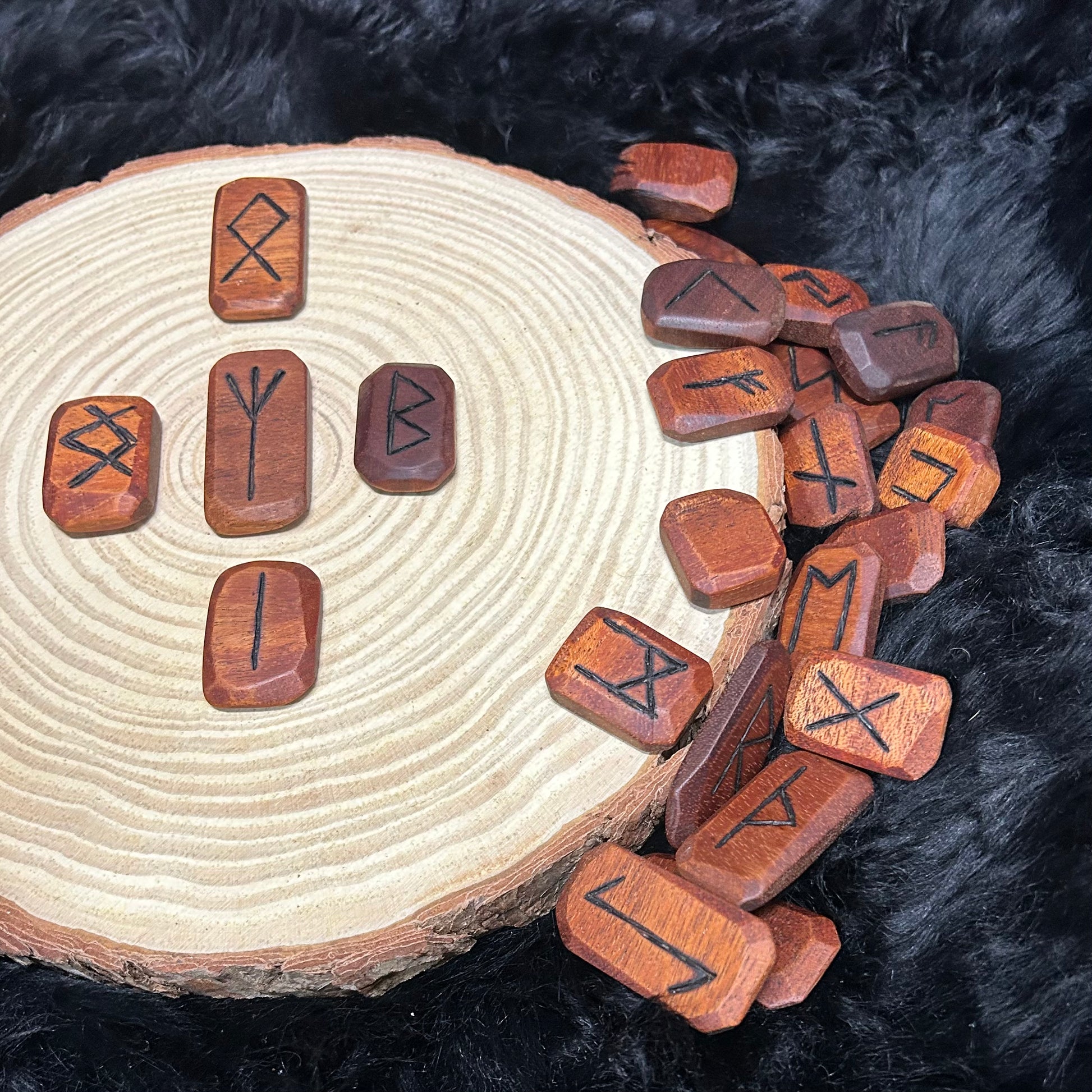 Lovingly crafted by a Viking who takes his runes seriously, these Mixed Wood Runes are meticulously shaped into various sizes and sanded from either assorted species of exotic woods, hardwood or native Florida wood species (bottlebrush, camphor, cedar, cypress, etc). Then, Viking Elder Futhark runes are applied to every piece using a Truart professional pyrography pen. The runes are sanded once more for a smooth finish. Next, for the exotic woods and hardwood runes Danish Oil is applied and allowed to seep into the wood for 24 hours. Natural runes are kept as much in their natural state as possible. Lastly, we give them a dry buff with a clean cloth and storage in paper-lined containers which removes any excess oils and readies them for use. Measuring approximately 3/4 to 1 inch by 1-1/4 to 1-1/2 inches and about 1/8 to 3/8 inches thick, each rune set showcases the unique beauty of handmade craftsmanship.