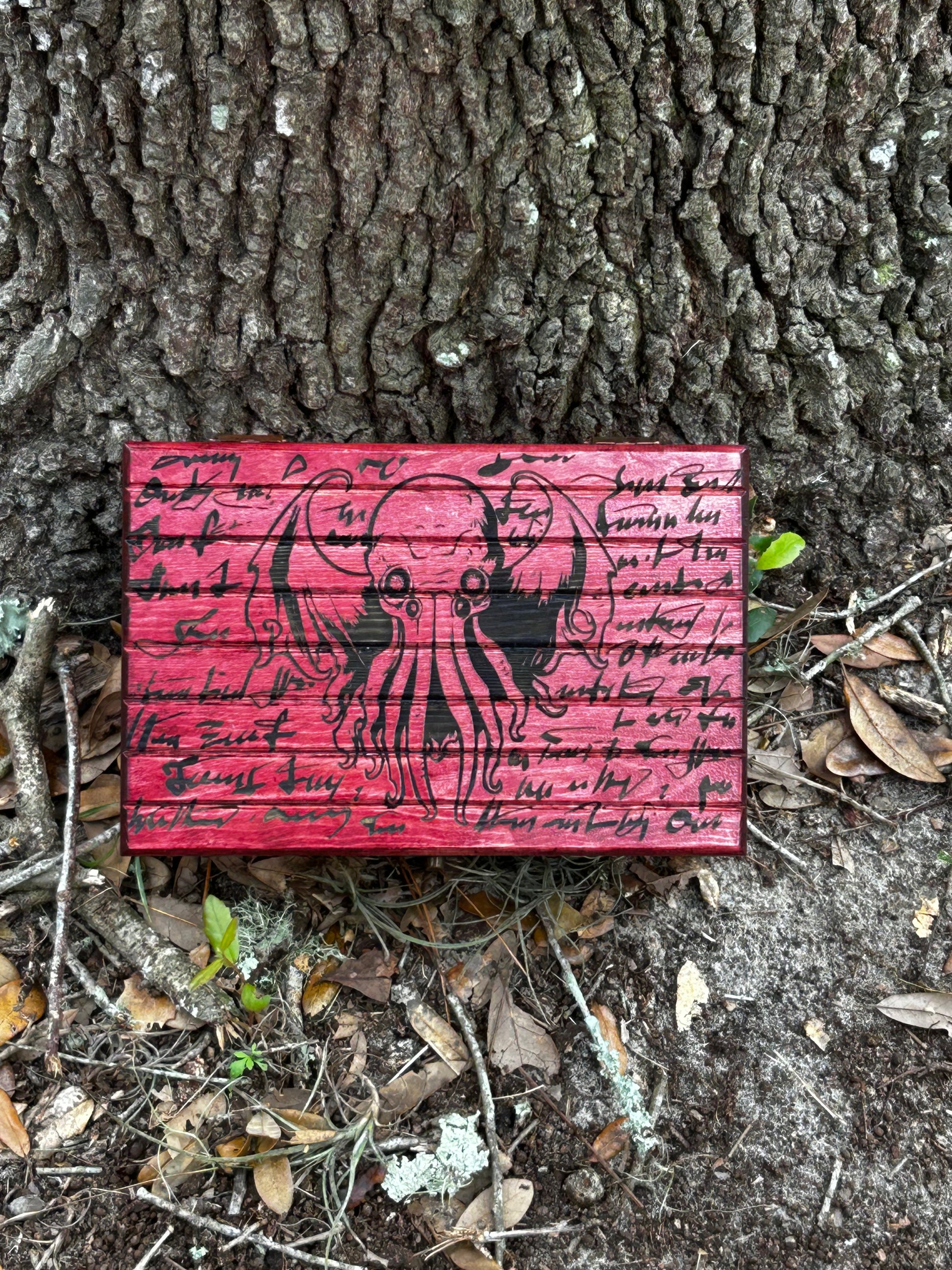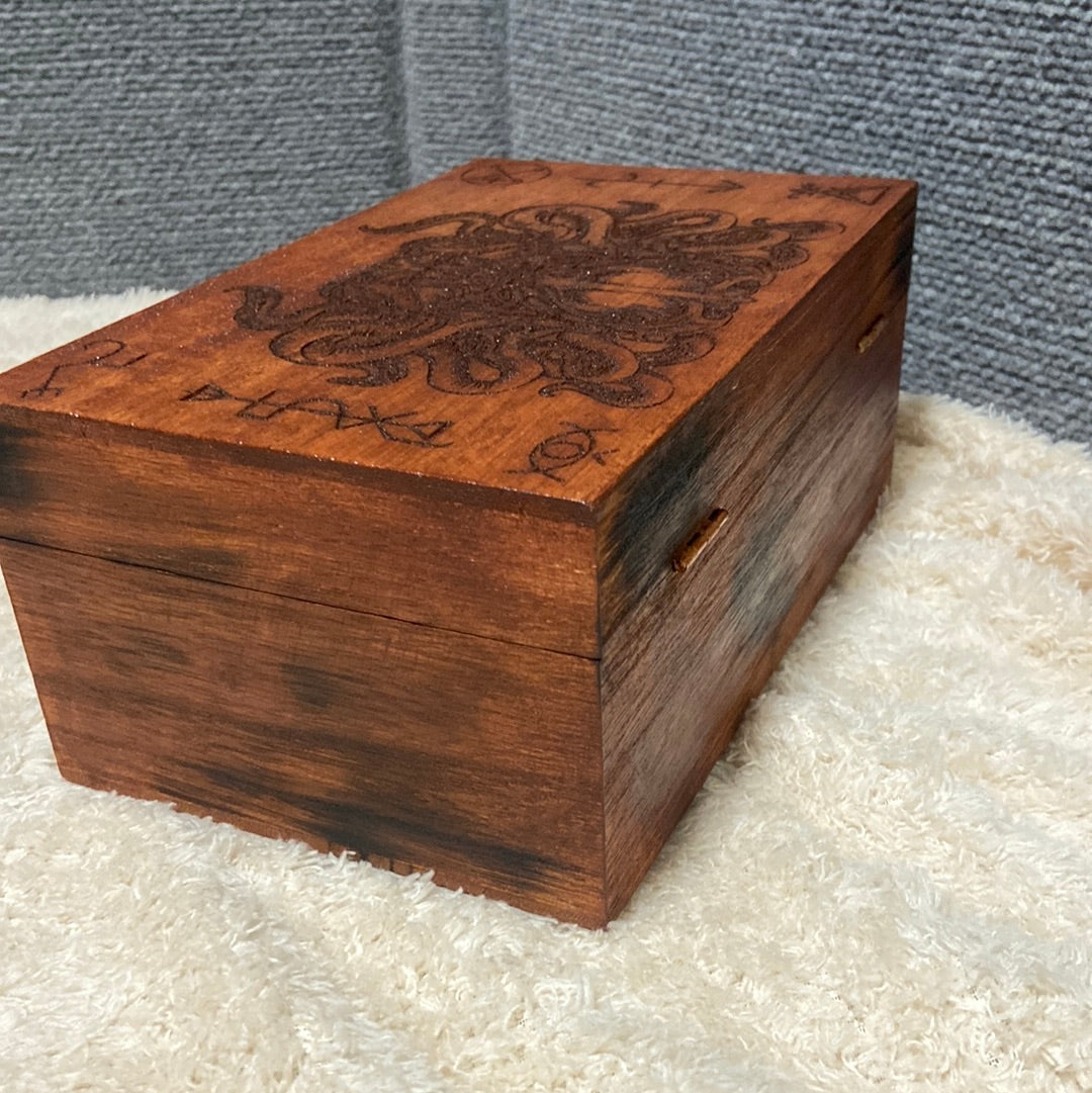 This medium chest features the elder one in all its horrific glory as well as some heinous vile mystic runes said to represent the names of other lesser but powerful ancient entities. Appx 8.5x 5x4?