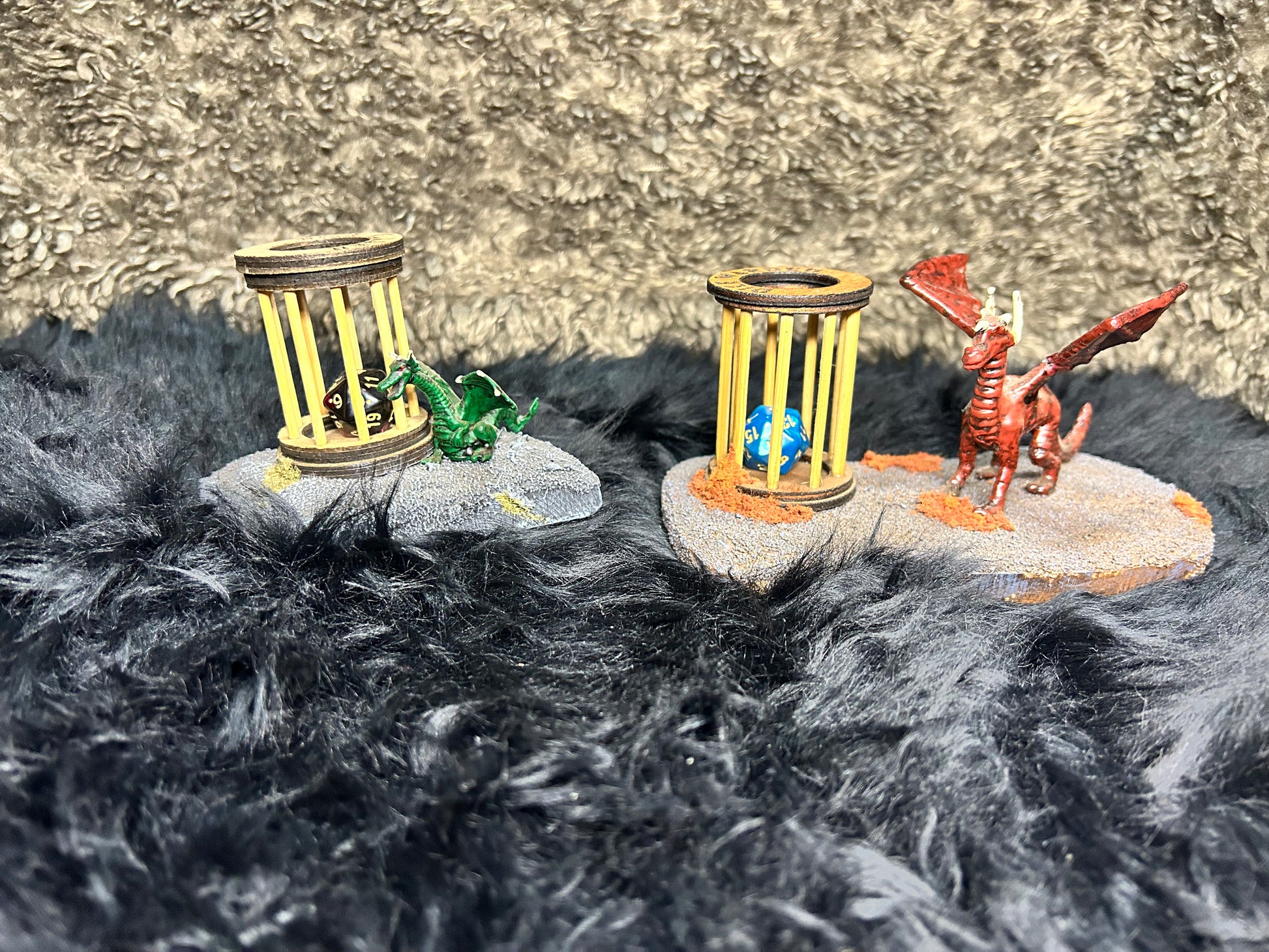 These hybrid works are made from a wooden base and prison cell and a miniature figure. The mini and base are hand painted. The prison cell and mini are mounted on the flocked and painted base.
