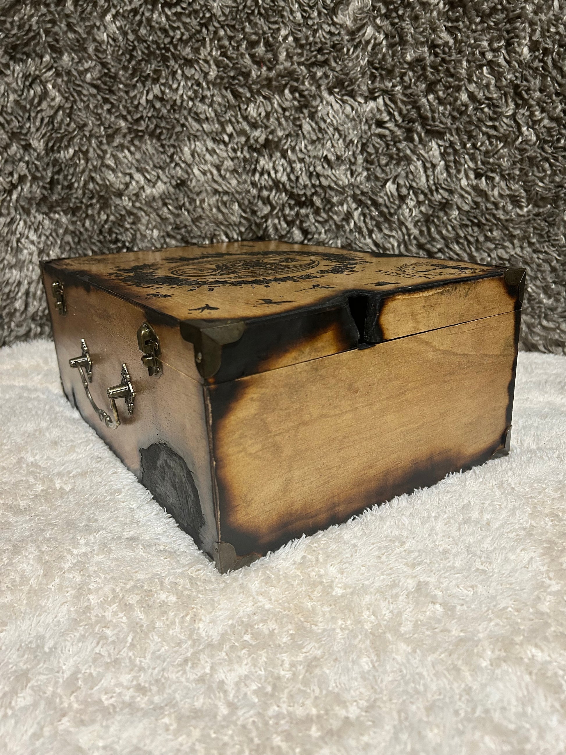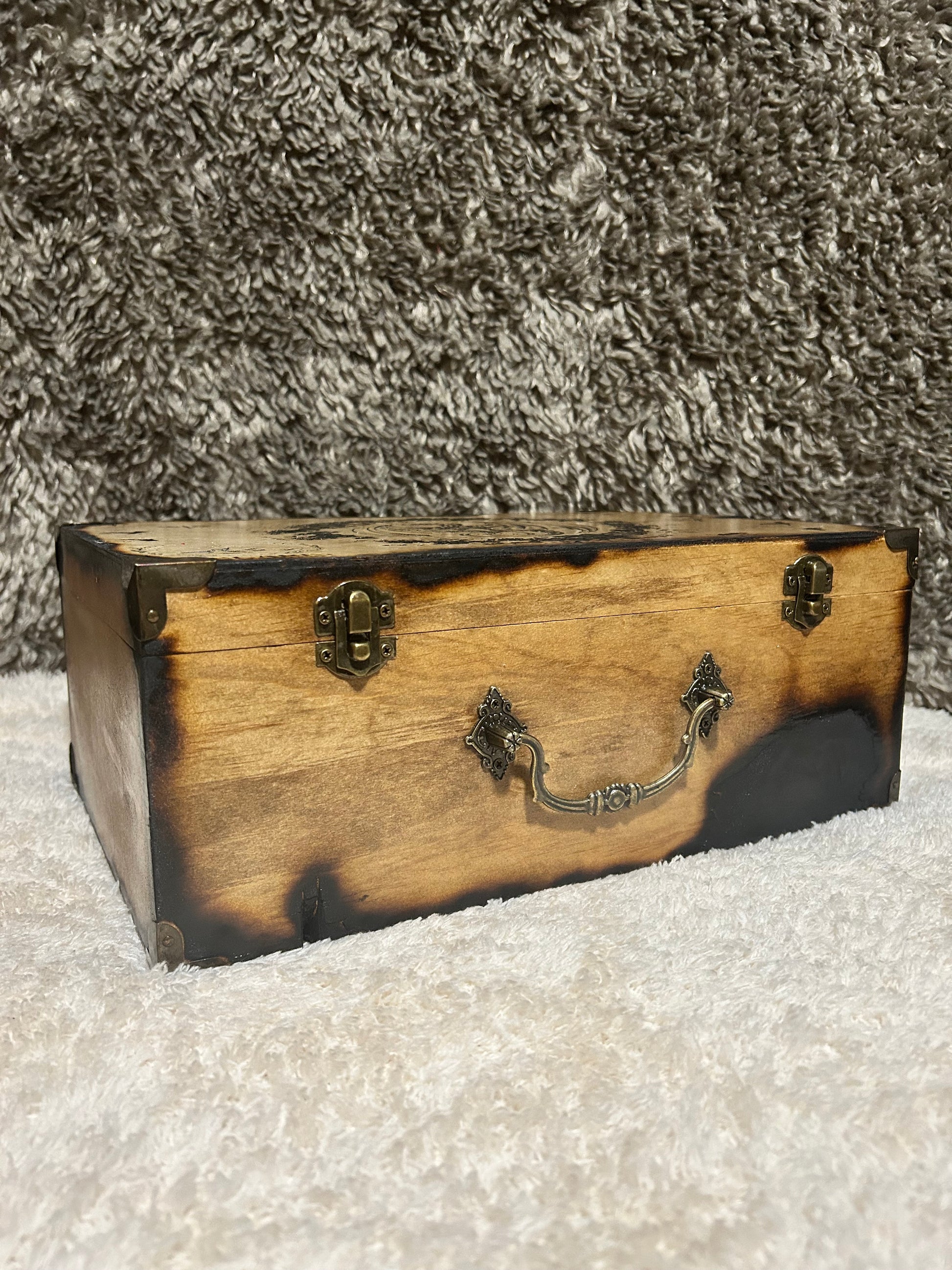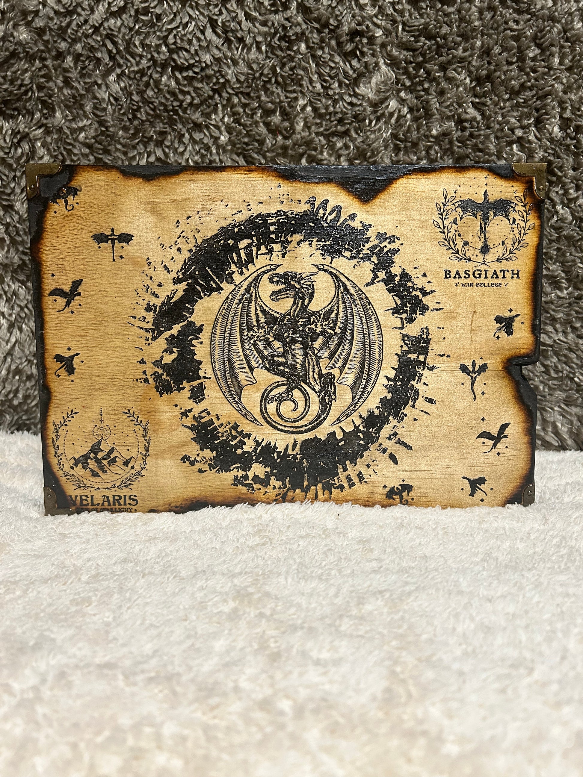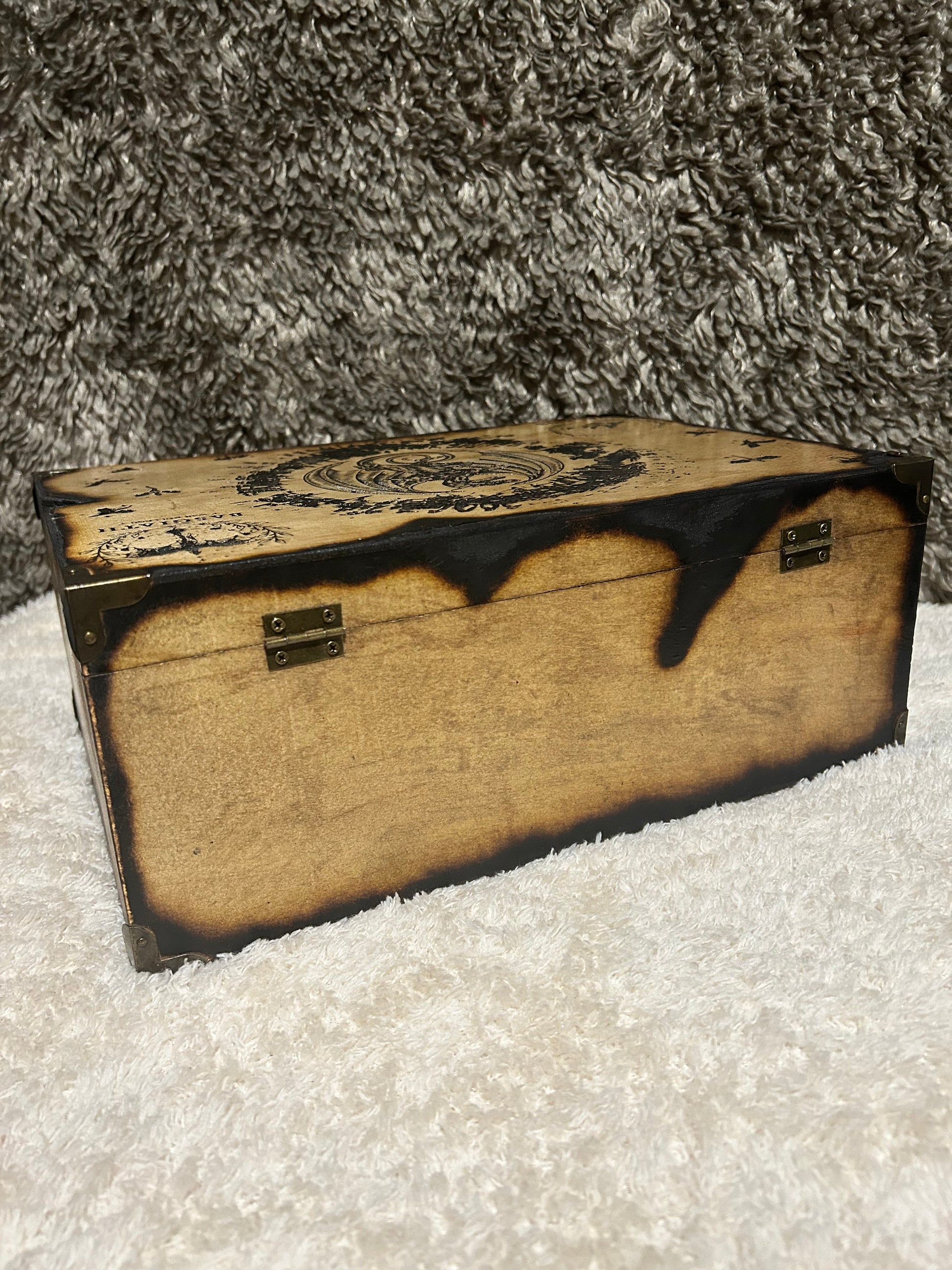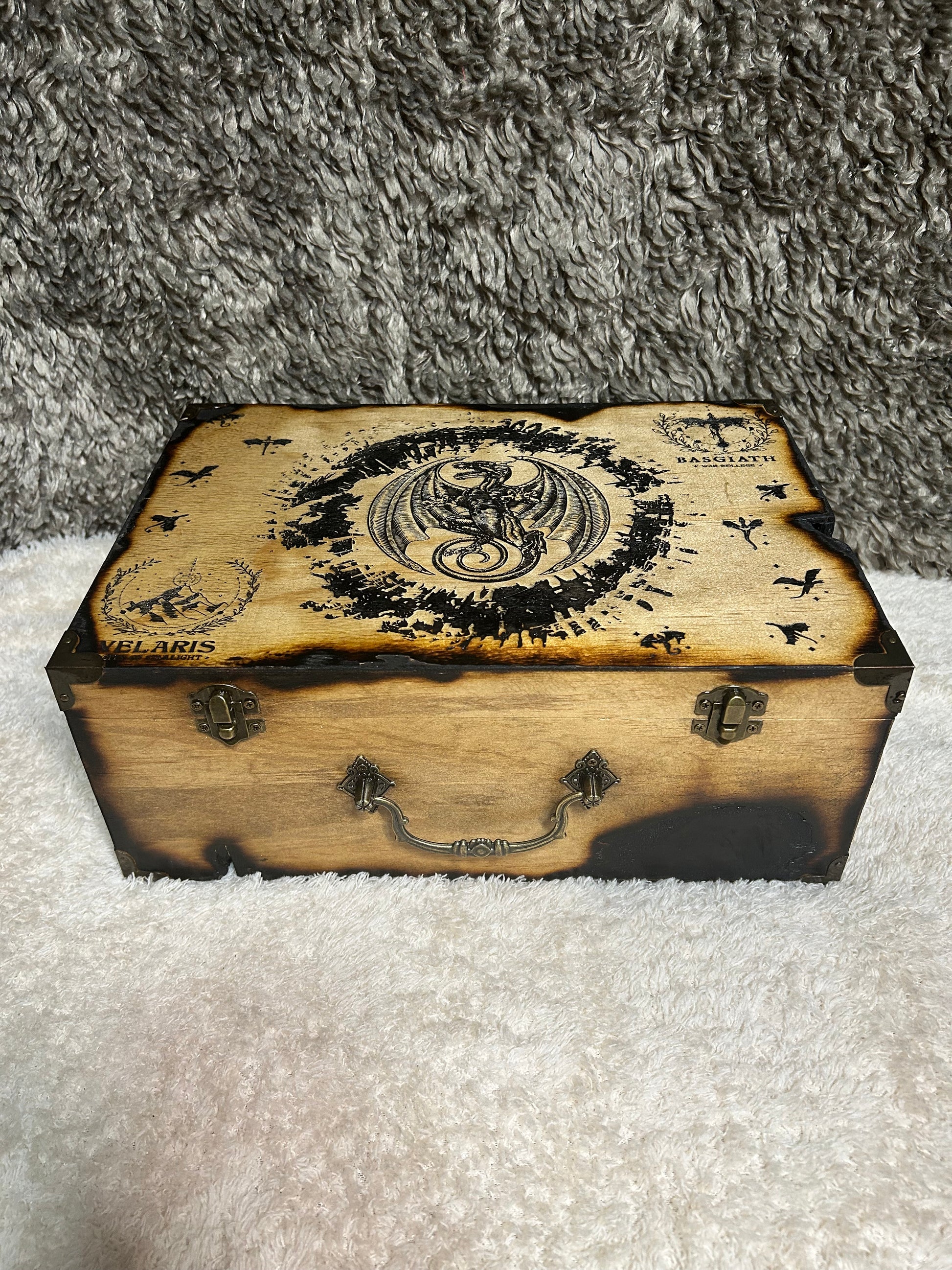 Drawing inspiration from the Fourth Wing novels, this chest exudes grandeur. Featuring antique-style handles and metal embellishments, it measures approximately 10x12x5 and offers versatile storage for keepsakes and other items.
