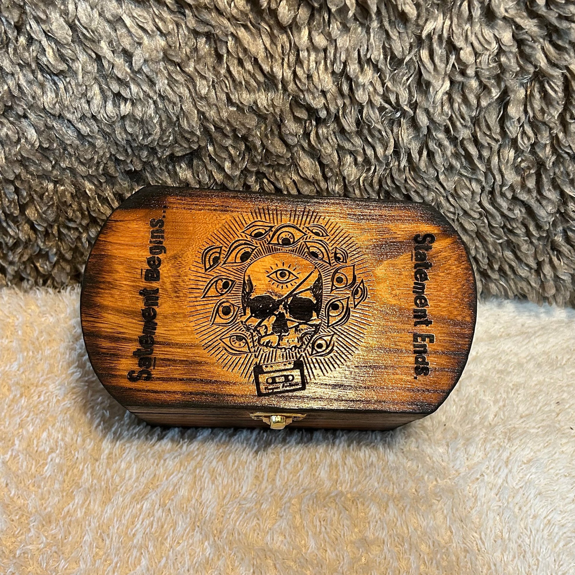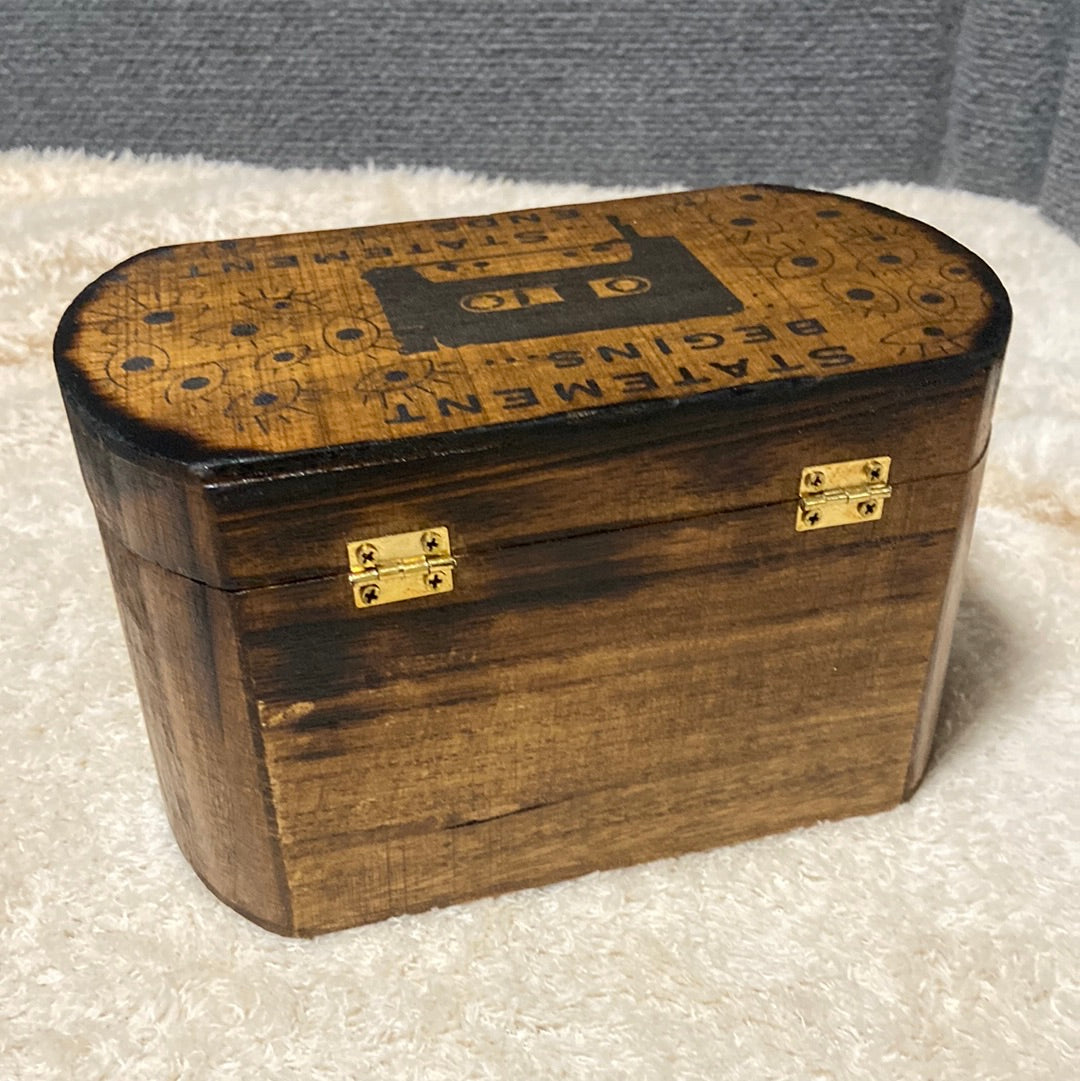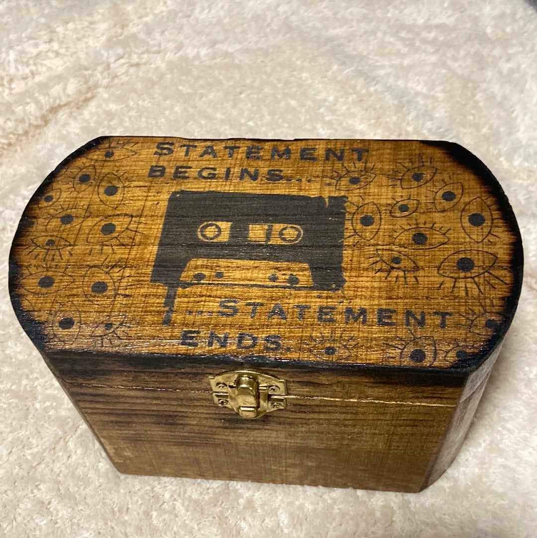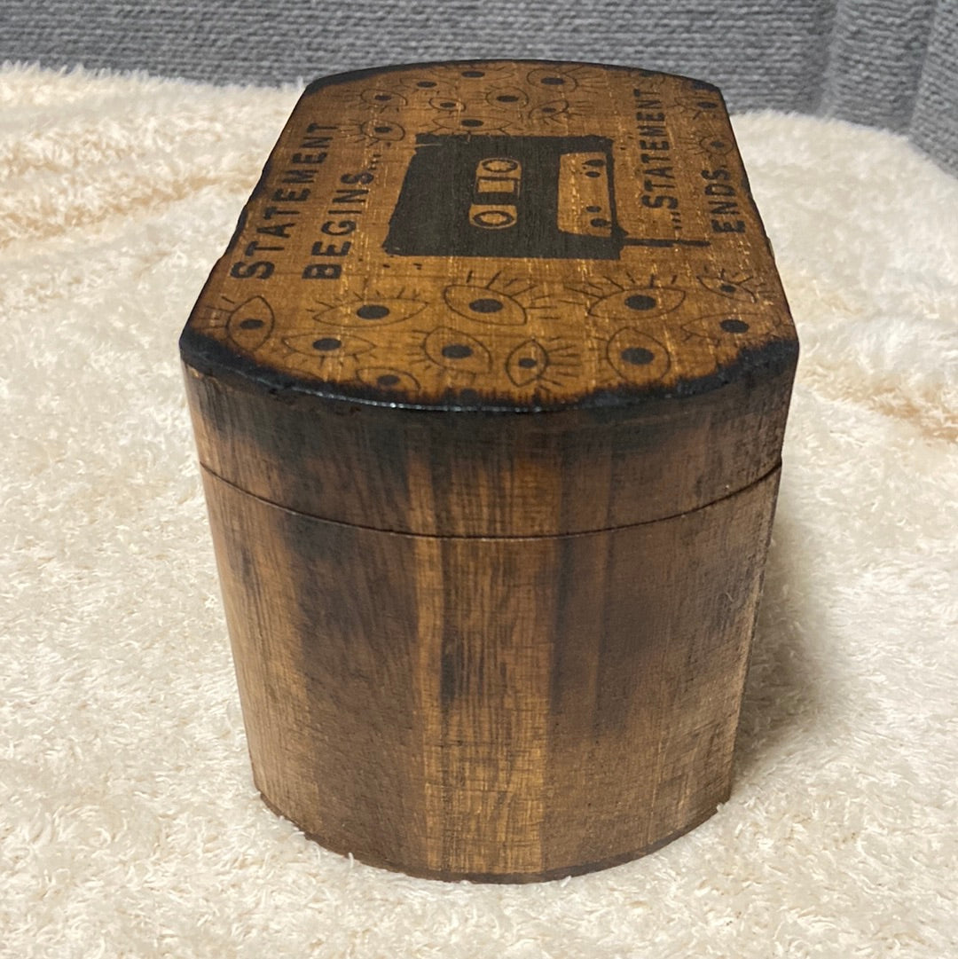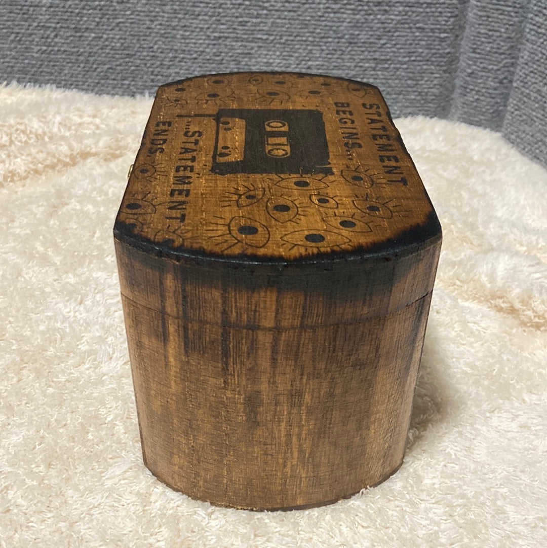 This 7.5x5x4 wood chest has imagery inspired by The Magnus Archives horror anthology podcast! Regardless of The Great Eye that watches all who linger in terror and gorges itself on the sufferings of those under its unrelenting stuporous gaze, this is a cool and useful box.