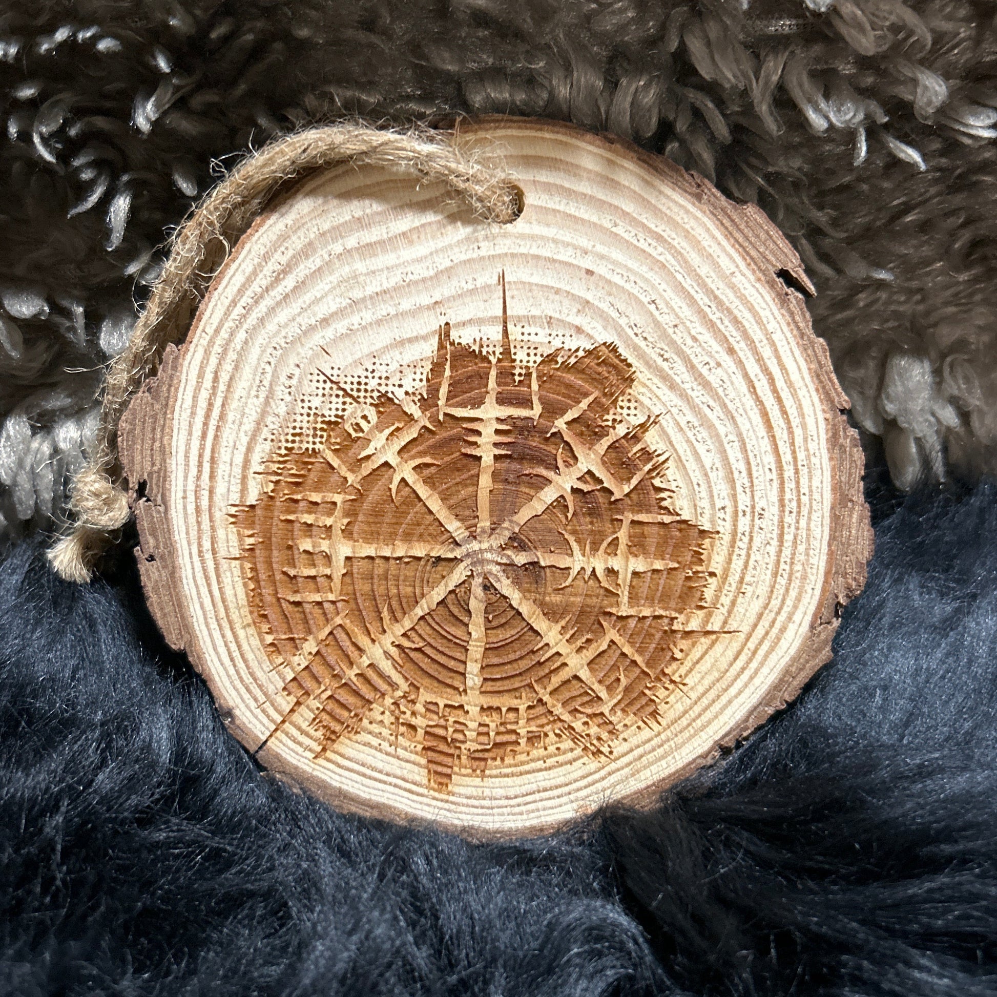 Natural 5 inch wooden slice emblazoned with the Viking Compass aka Vegvisir.