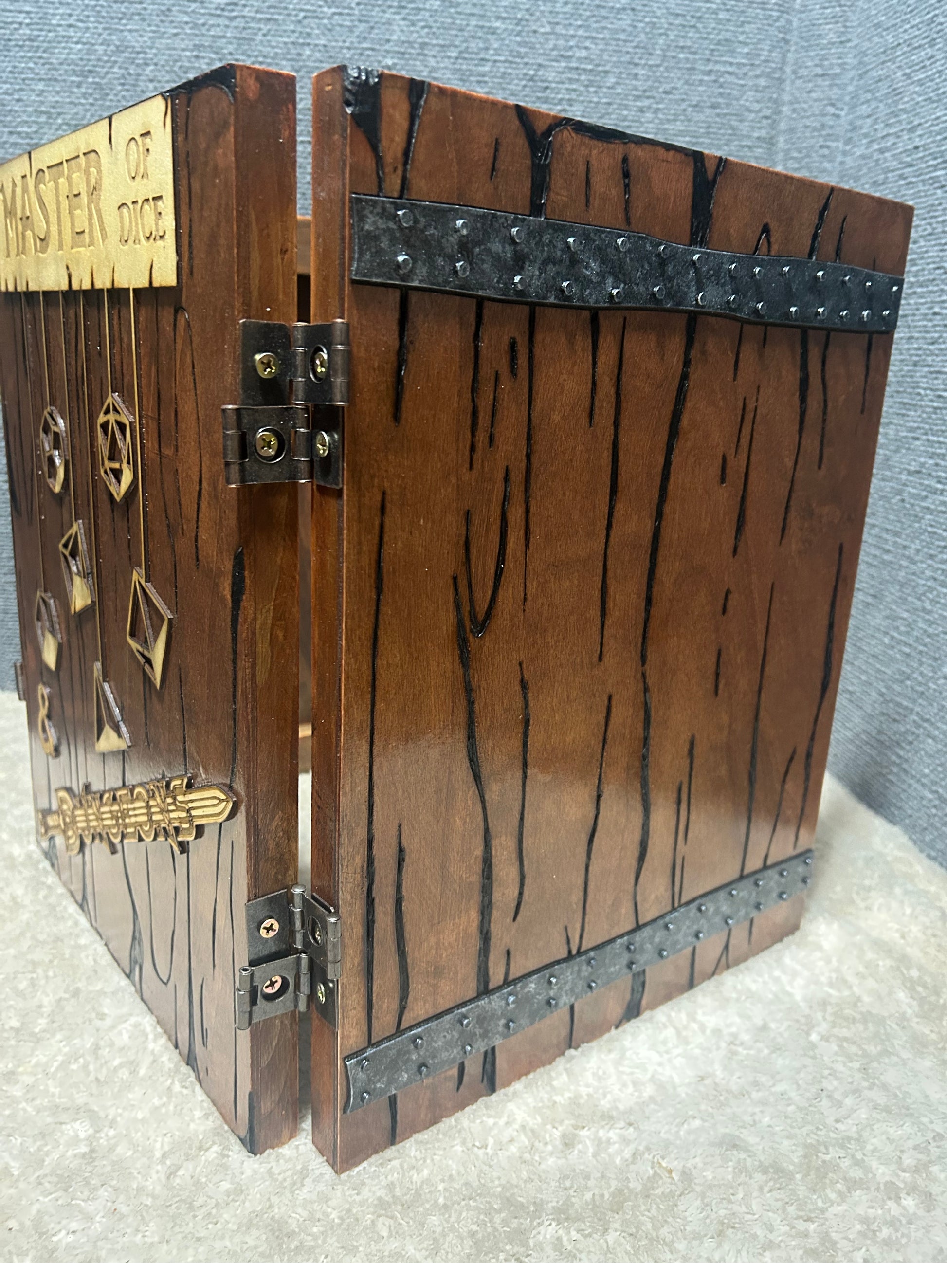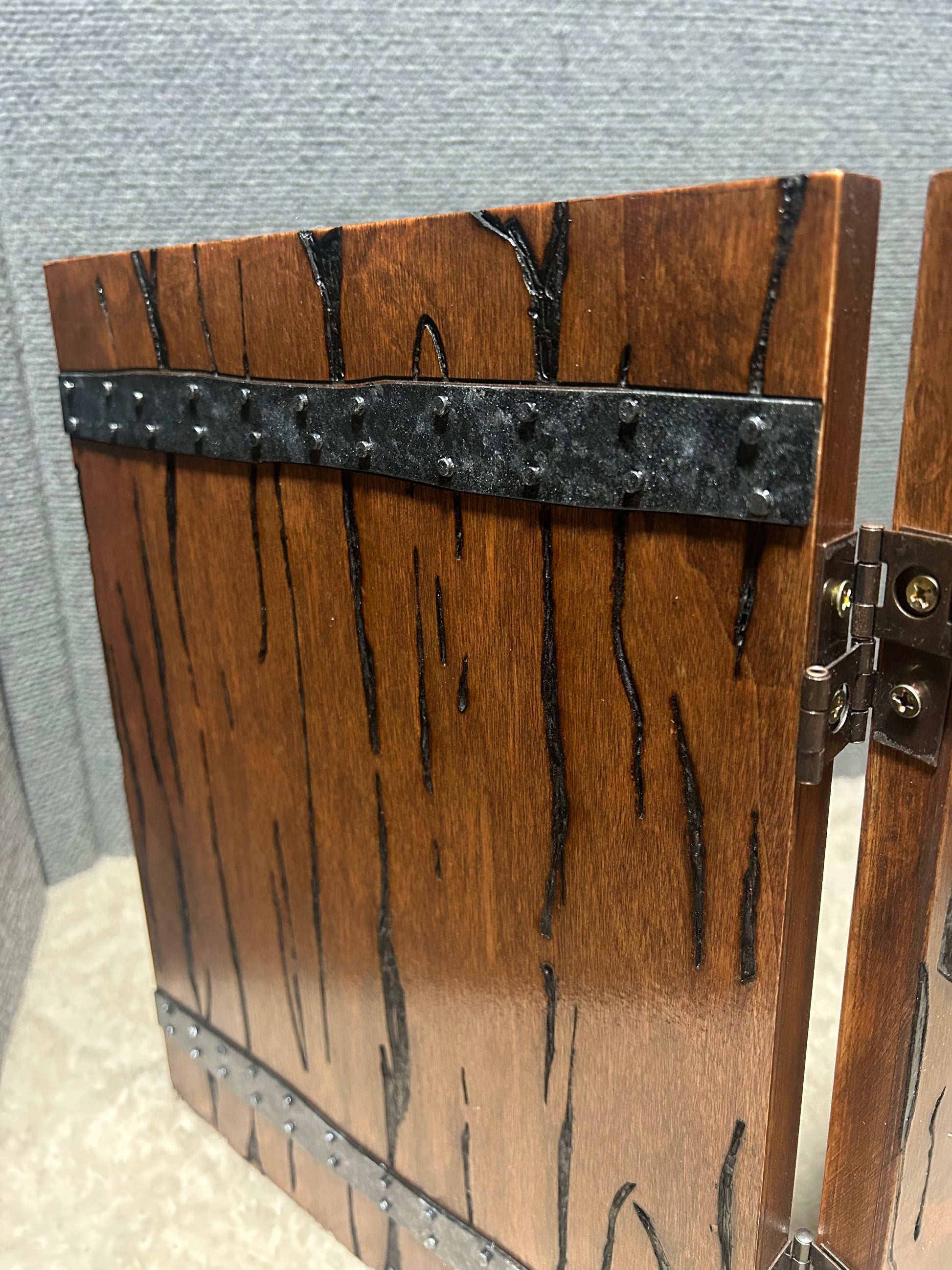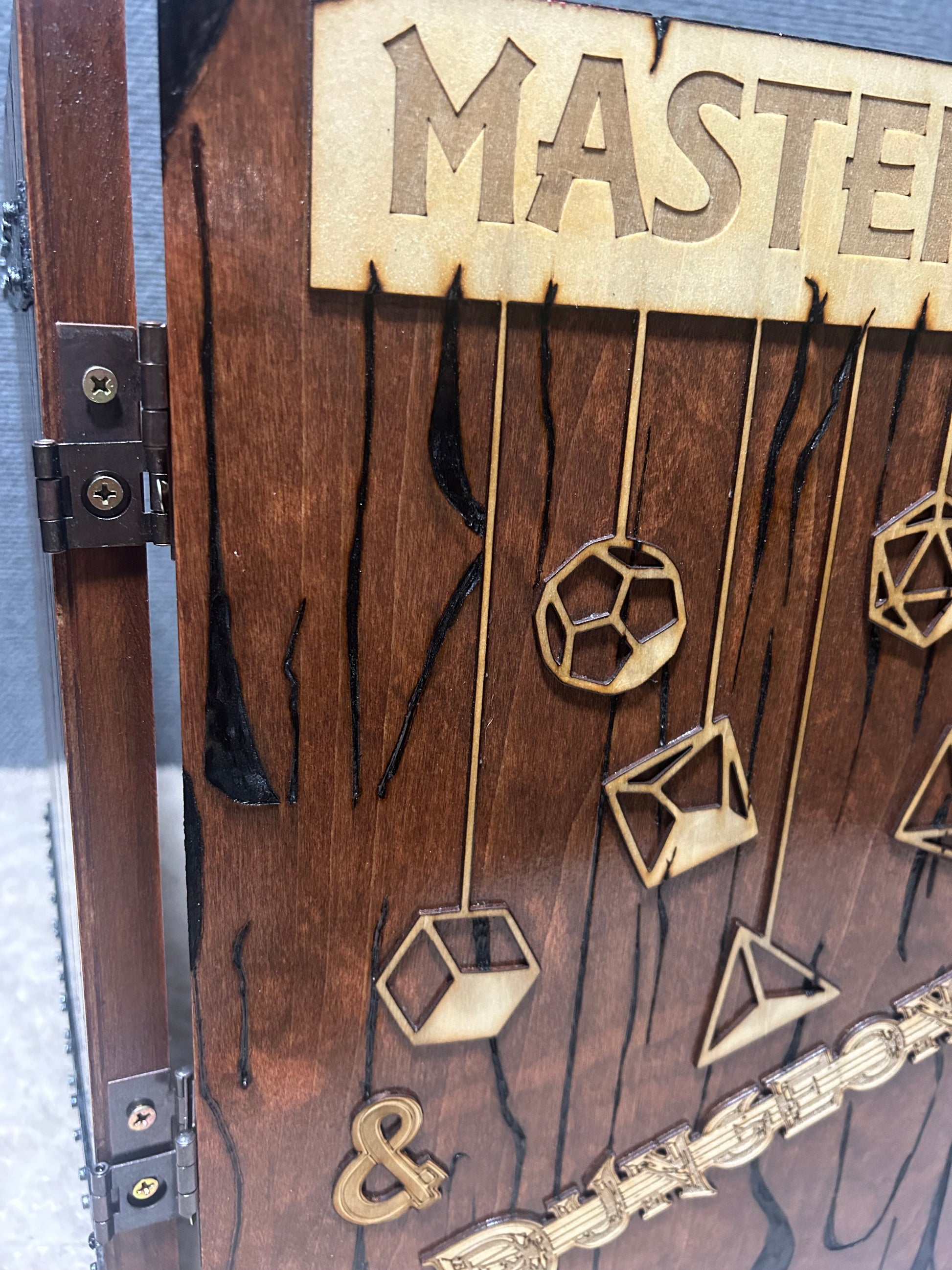 The GM screen is made from wood, each with a cool design and given a badass finish. We try to keep several styles to choose from but often cannot. ? (they go quickly).